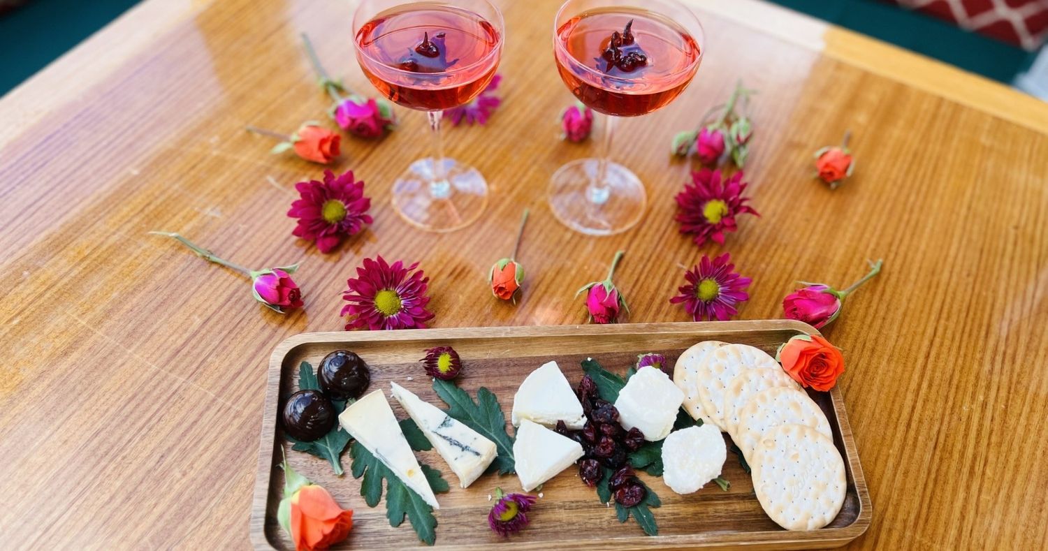 A four-glass champagne flight and a tasting plate of cheeses, fruit, fine chocolate and accoutrements to pair with each glass.