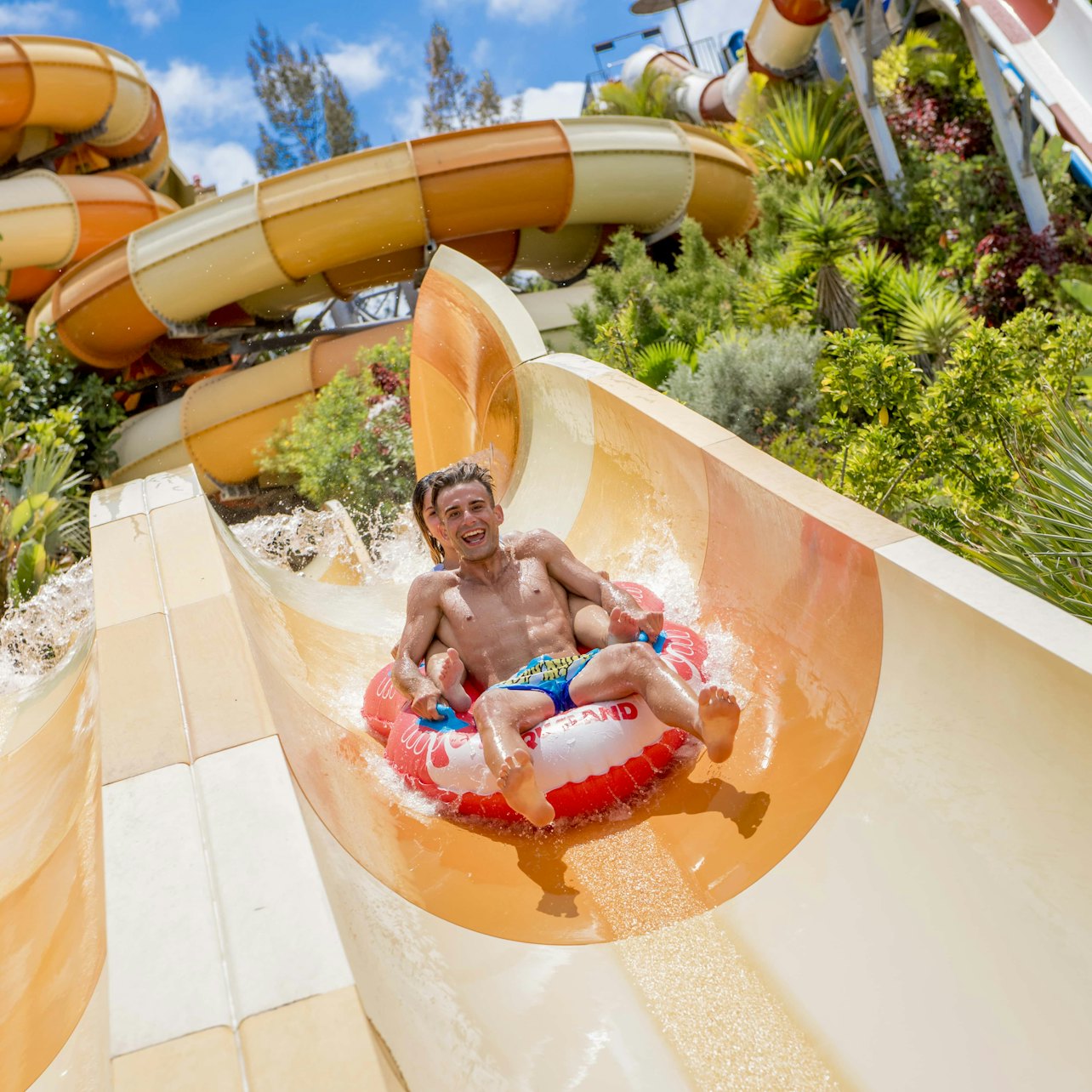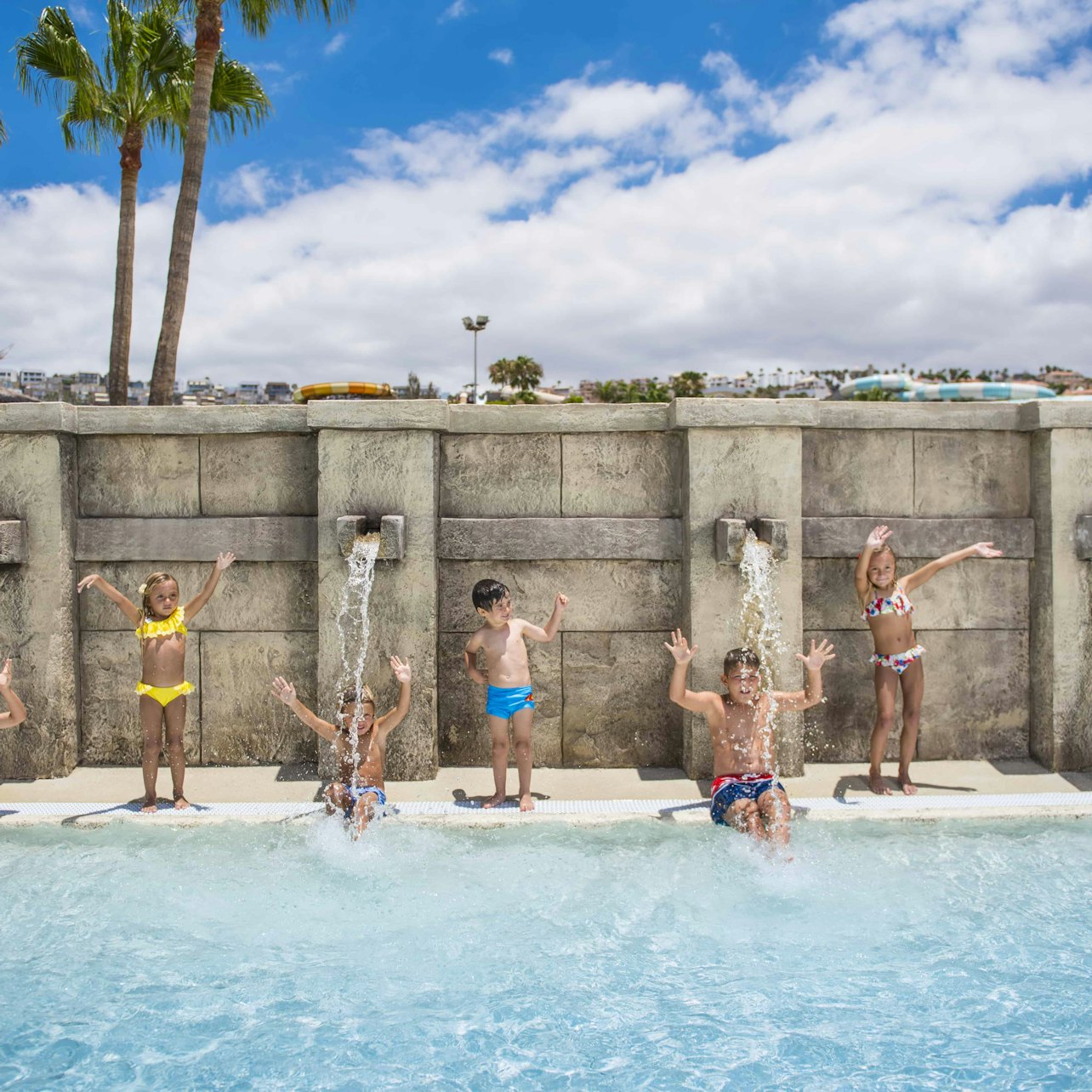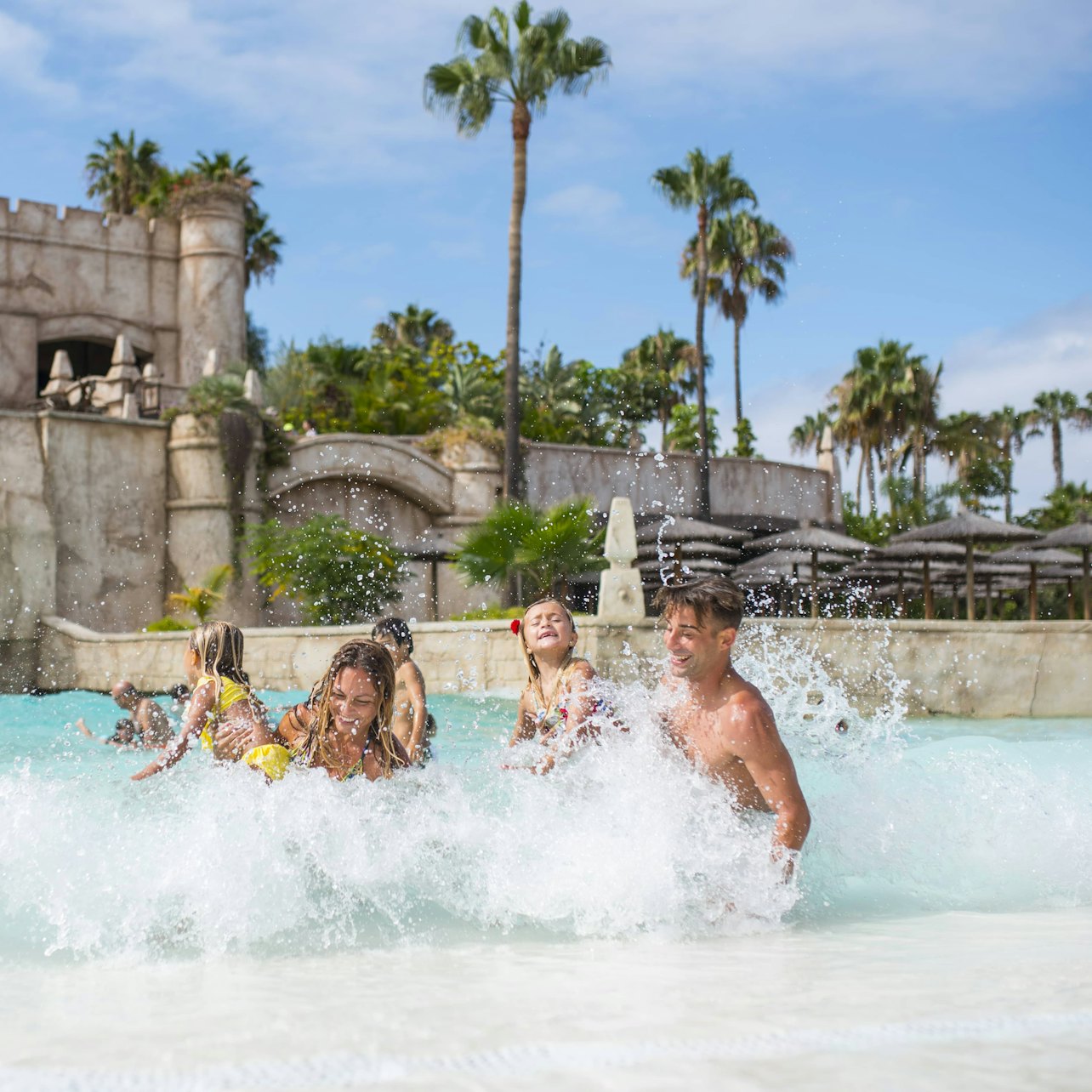 Dive into a world of watery adventure in Tenerife's Aqualand Costa Adeje. The park's giant waterslides, like the new and fun *Tsunami and Cyclones*, or *Tornado* and *Kamikaze*, *Twister Racer* and *Multisurf* are guaranteed to have you screaming for more, while the *Lava River* and wave pool are perfect for relaxing. Kids will have a blast splashing around in *Adventure Island* and *Pirate Port*, while grownups can get some me-time in the open-air spa, complete with jacuzzis and powerful hydro-massage showers. And then there are the majestic dolphins! You'll be able to catch your finned friends doing their fabulous thing with live shows at 3:30 pm every day in the dedicated arena. The whole family can make a splash in this watery wonderland!