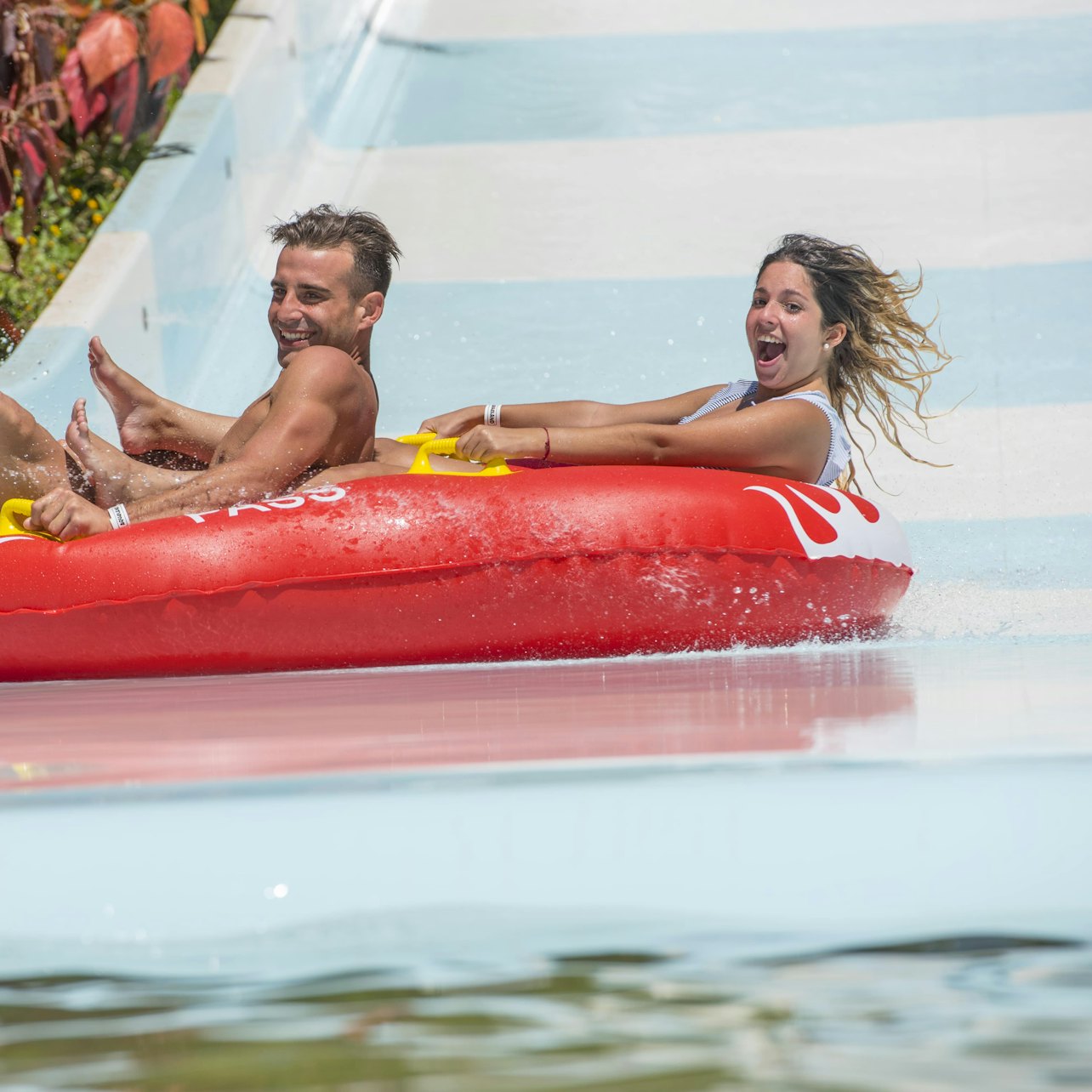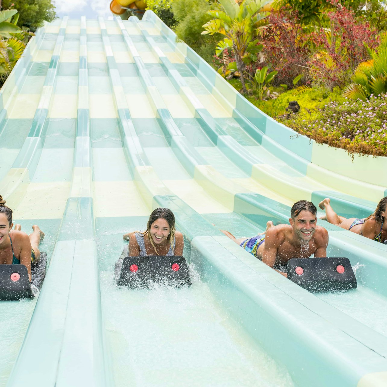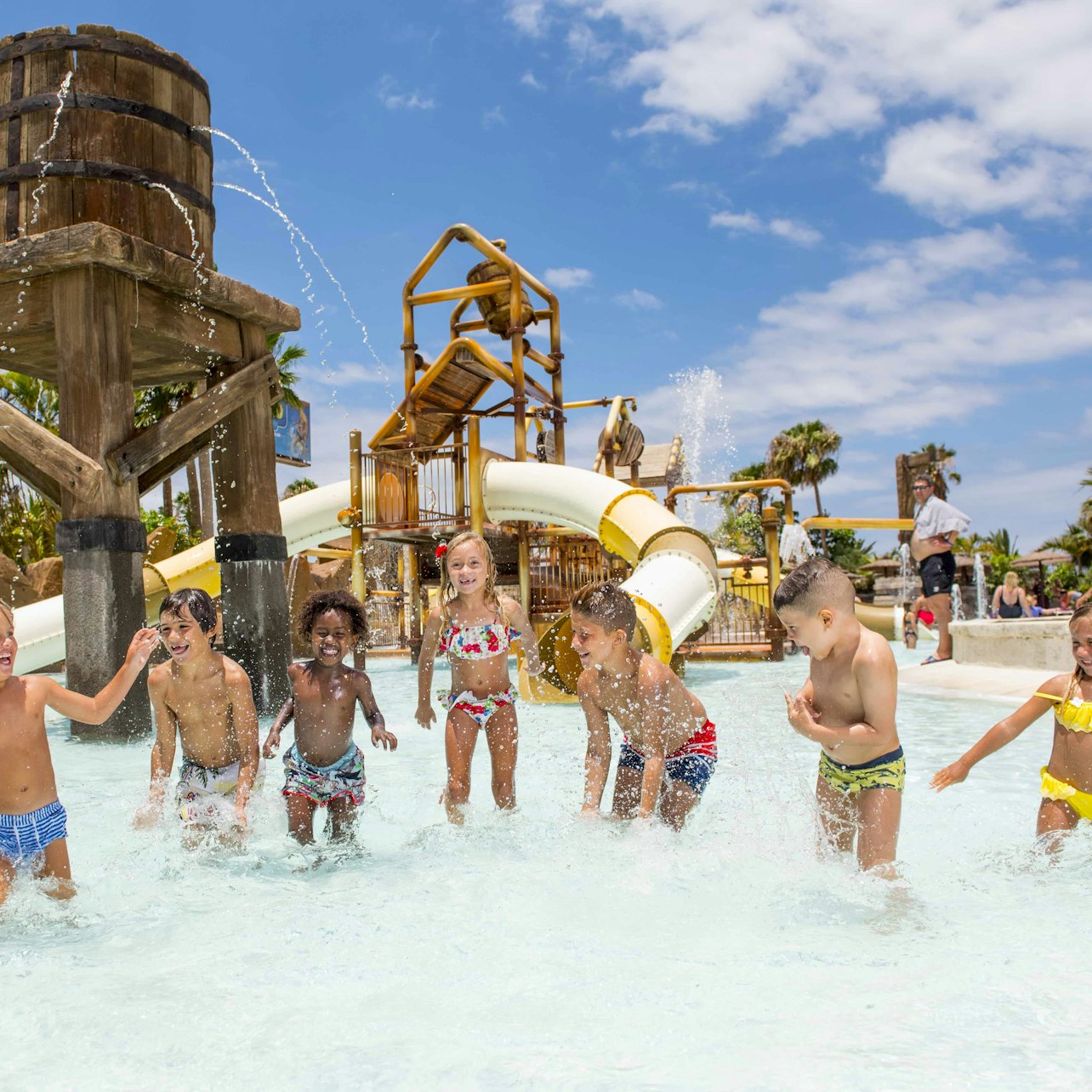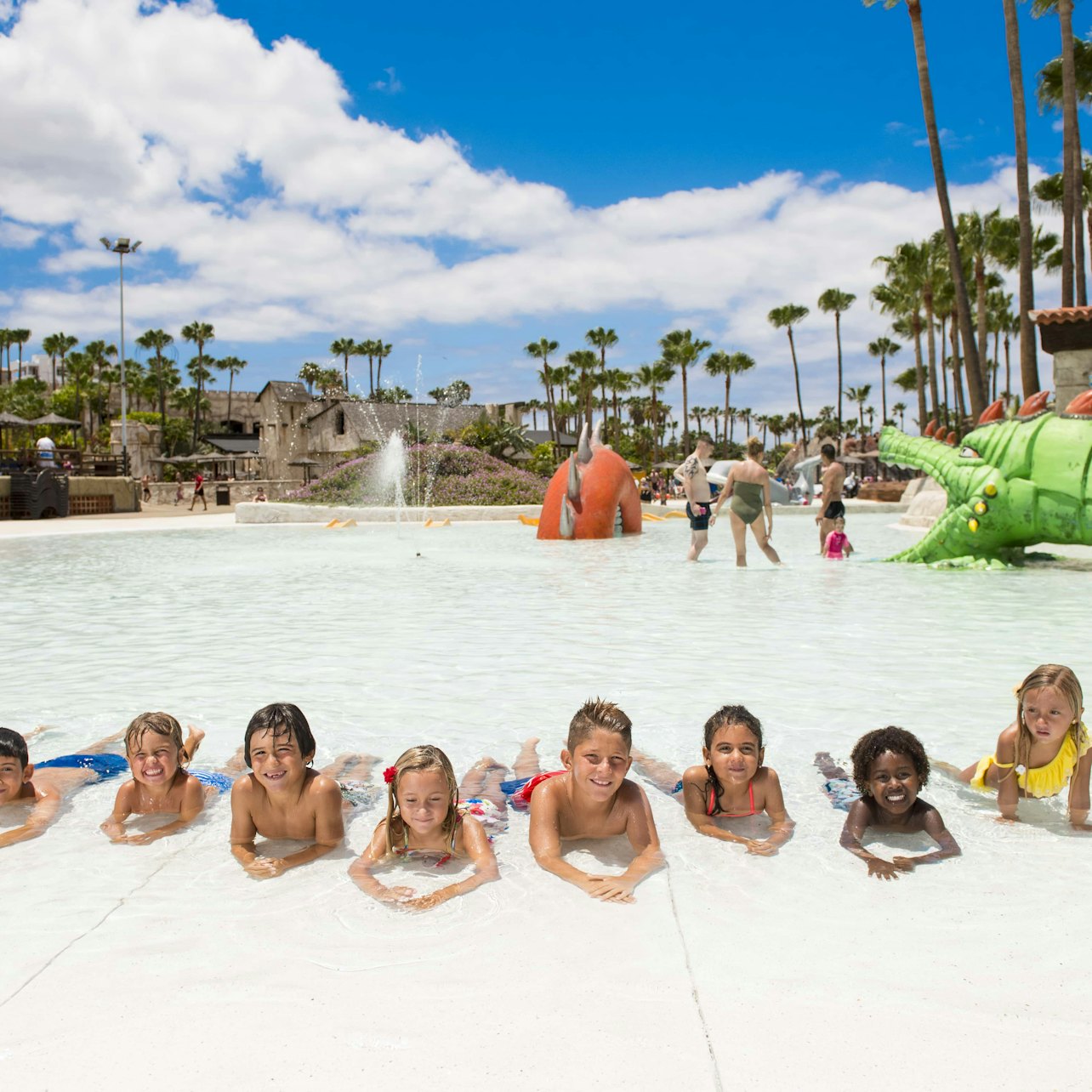 Dive into a world of watery adventure in Tenerife's Aqualand Costa Adeje. The park's giant waterslides, like the new and fun *Tsunami and Cyclones*, or *Tornado* and *Kamikaze*, *Twister Racer* and *Multisurf* are guaranteed to have you screaming for more, while the *Lava River* and wave pool are perfect for relaxing. Kids will have a blast splashing around in *Adventure Island* and *Pirate Port*, while grownups can get some me-time in the open-air spa, complete with jacuzzis and powerful hydro-massage showers. And then there are the majestic dolphins! You'll be able to catch your finned friends doing their fabulous thing with live shows at 3:30 pm every day in the dedicated arena. The whole family can make a splash in this watery wonderland!