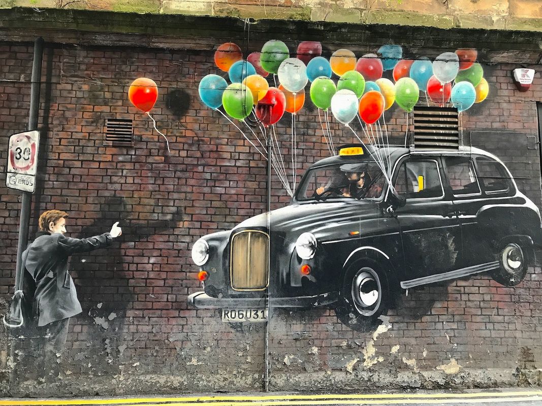 The World’s Most Economical TaxiThe World’s Most Economical Taxi, one of the most photographed murals in Glasgow by Rogue-One, with a curious fact: the brick wall is actually painted!