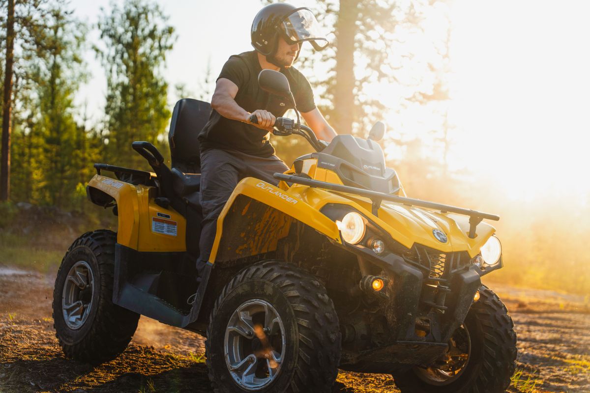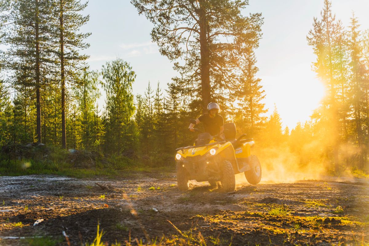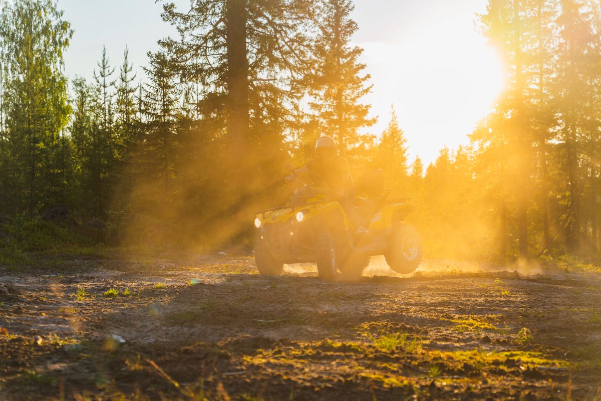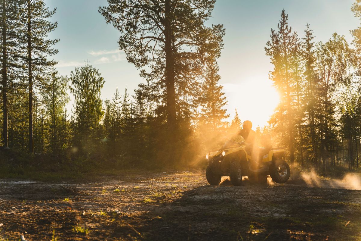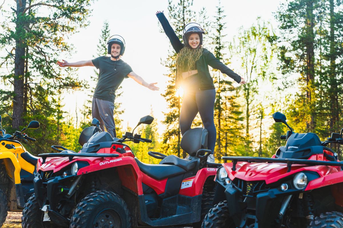 Bevor Sie auf das ATV steigen, zeigen Ihnen unsere Guides, wie man ein ATV fährt, und geben Ihnen Sicherheitsanweisungen. Dann fahren Sie durch den arktischen Wald und genießen die Sonne, die durch die Bäume schaut.