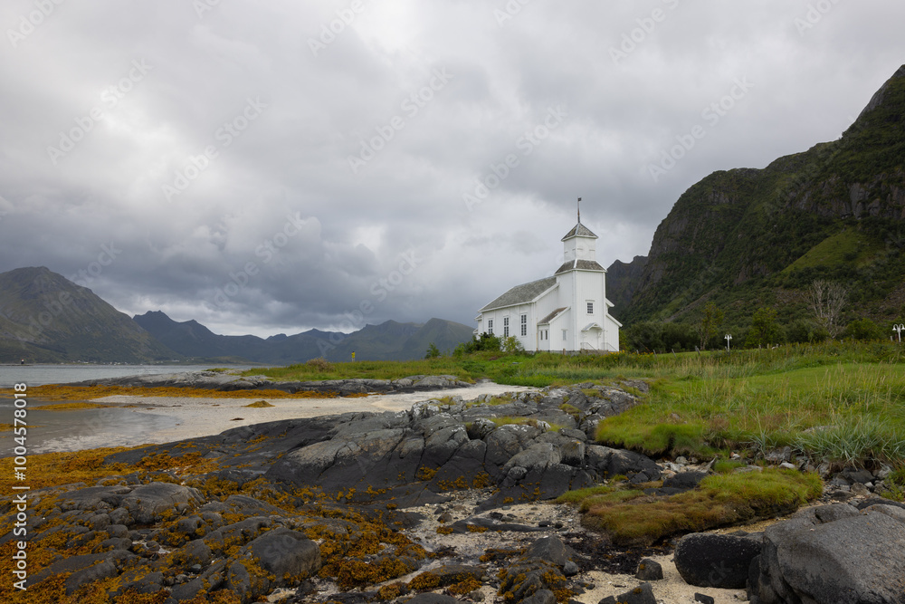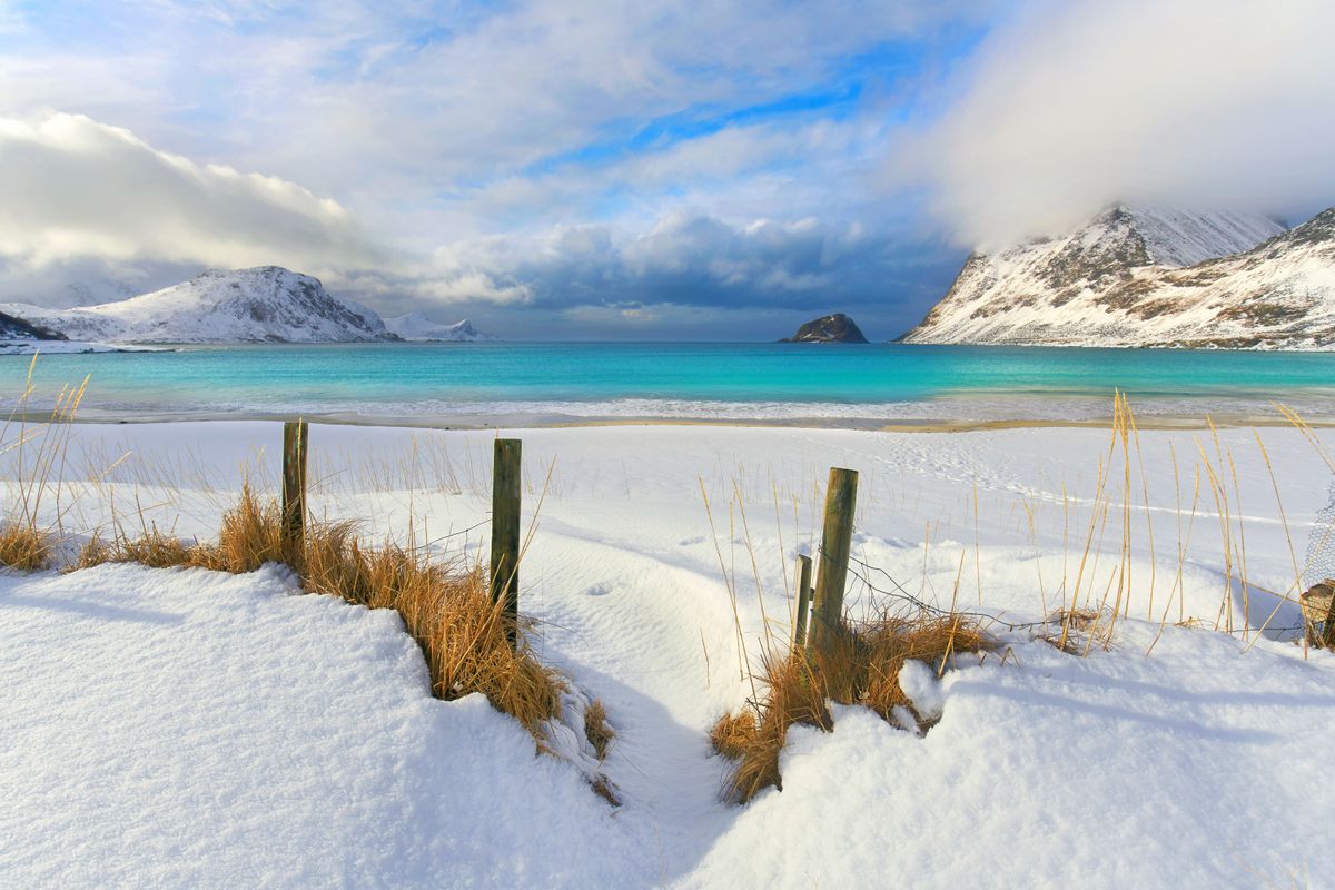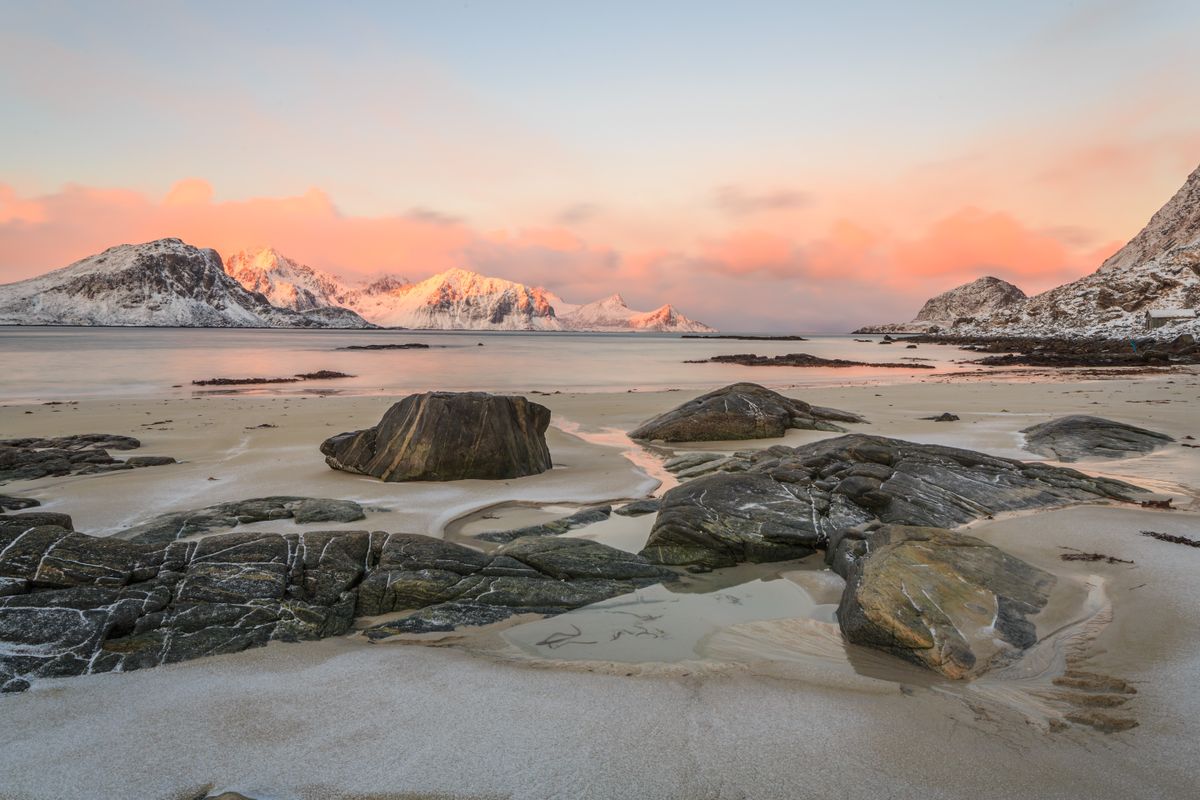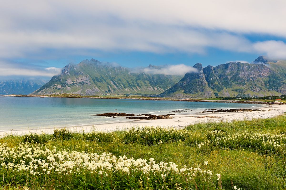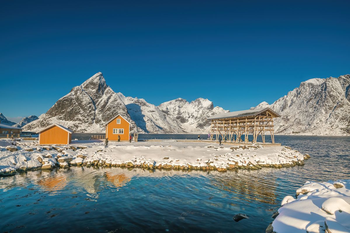 Als nächstes besuchen wir den Haukland Beach, der oft zu einem der besten Strände der Lofoten gewählt wurde. Hier treffen türkisfarbenes Wasser auf weißen Sand und wir werden die Kirche von Vågan erkunden, die auch als „Lofoten-Kathedrale“ bekannt ist. Anschließend fahren wir nach Henningsvær, einer lebhaften Hafenstadt, die für ihre Holzhäuser und das ikonische Fußballfeld bekannt ist, das von Wasser umgeben ist. Auf dem Weg dorthin halten wir am Strand von Rørvik, einem aufgehenden Stern unter den schönsten Küstenorten der Lofoten.