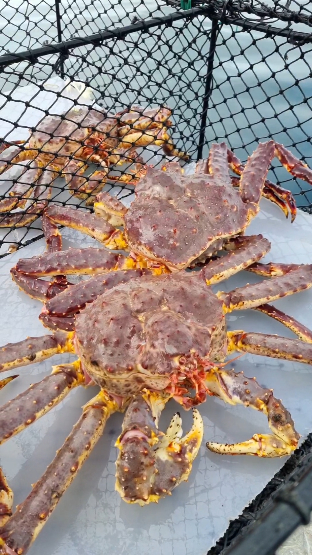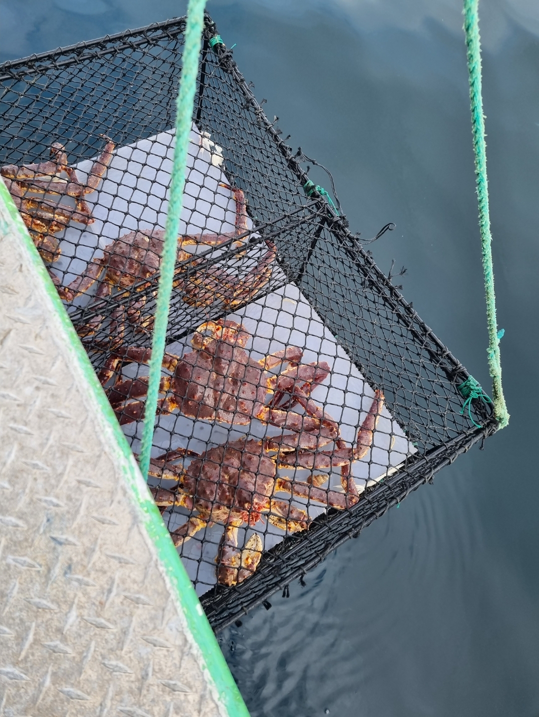 Die Tour geht zu unserem Krabbenfeld im Alta Fjord. Die rote Königskrabbe wird in einer kastenförmigen Falle gefangen, einem sogenannten Topf, der dann aus dem Meer in das Boot gezogen wird. Sie können den Kapitän bei der Arbeit beobachten, wie er es schon oft getan hat. Wenn die Königskrabbe an Bord ist, können Sie sie vorsichtig halten und Fotos damit machen (das ergibt eine schöne Postkarte)