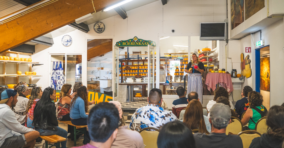 al pasado.Luego, cerca del colorido pueblo pesquero de Volendam, haz una parada en una quesería de gestión familiar para ver una demostración en vivo sobre cómo se elaboran los quesos Gouda y Edam. Pruebe los auténticos sabores holandeses y visite un taller de zuecos, donde descubrirá cómo se fabrican a mano estos icónicos zapatos de madera