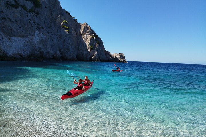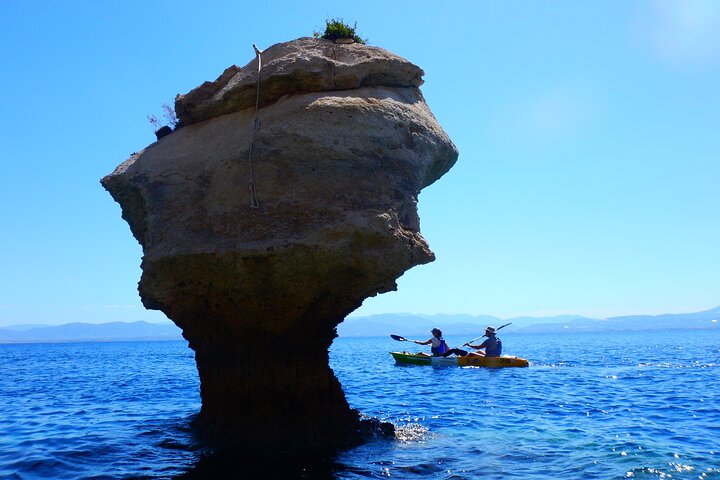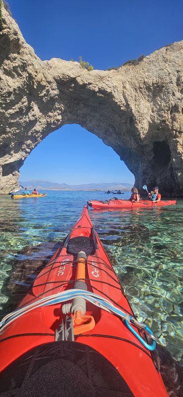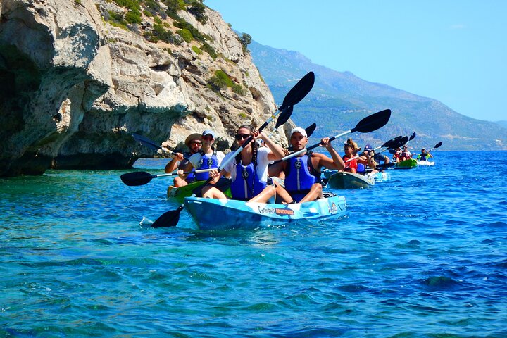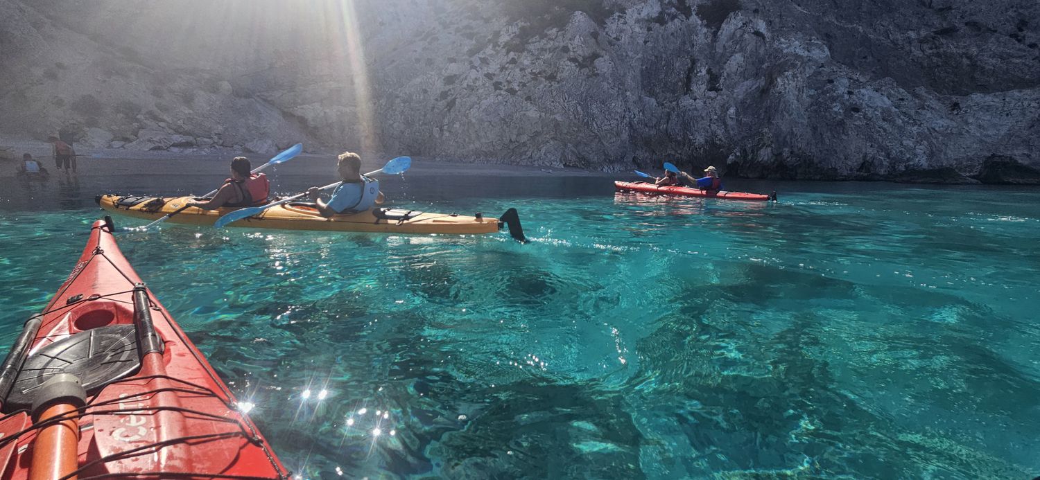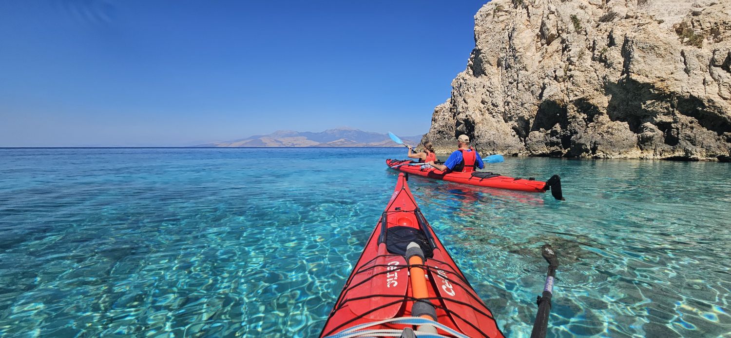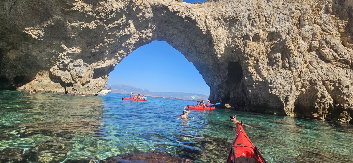 Nuestra aventura comienza en la playa de Alkyonidos, a las 10.30 de la mañana. Los guías certificados impartirán una breve lección en la playa sobre el uso correcto de los remos y los kayaks en el mar. Entonces estaremos listos para salir a la mar y comenzar nuestra aventura.