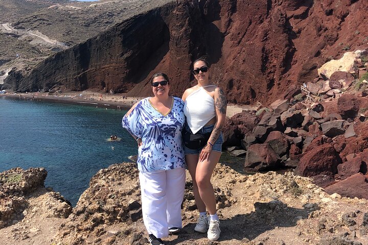 la encantadora arquitectura y el carácter local.Admire los paisajes volcánicos únicos de Santorini con paradas en la impresionante Playa Roja y las famosas playas de arena negra de Perivolos y Perissa, cada una de las cuales ofrece un contraste distintivo y una belleza natural moldeados por el pasado volcánico de la isla.
